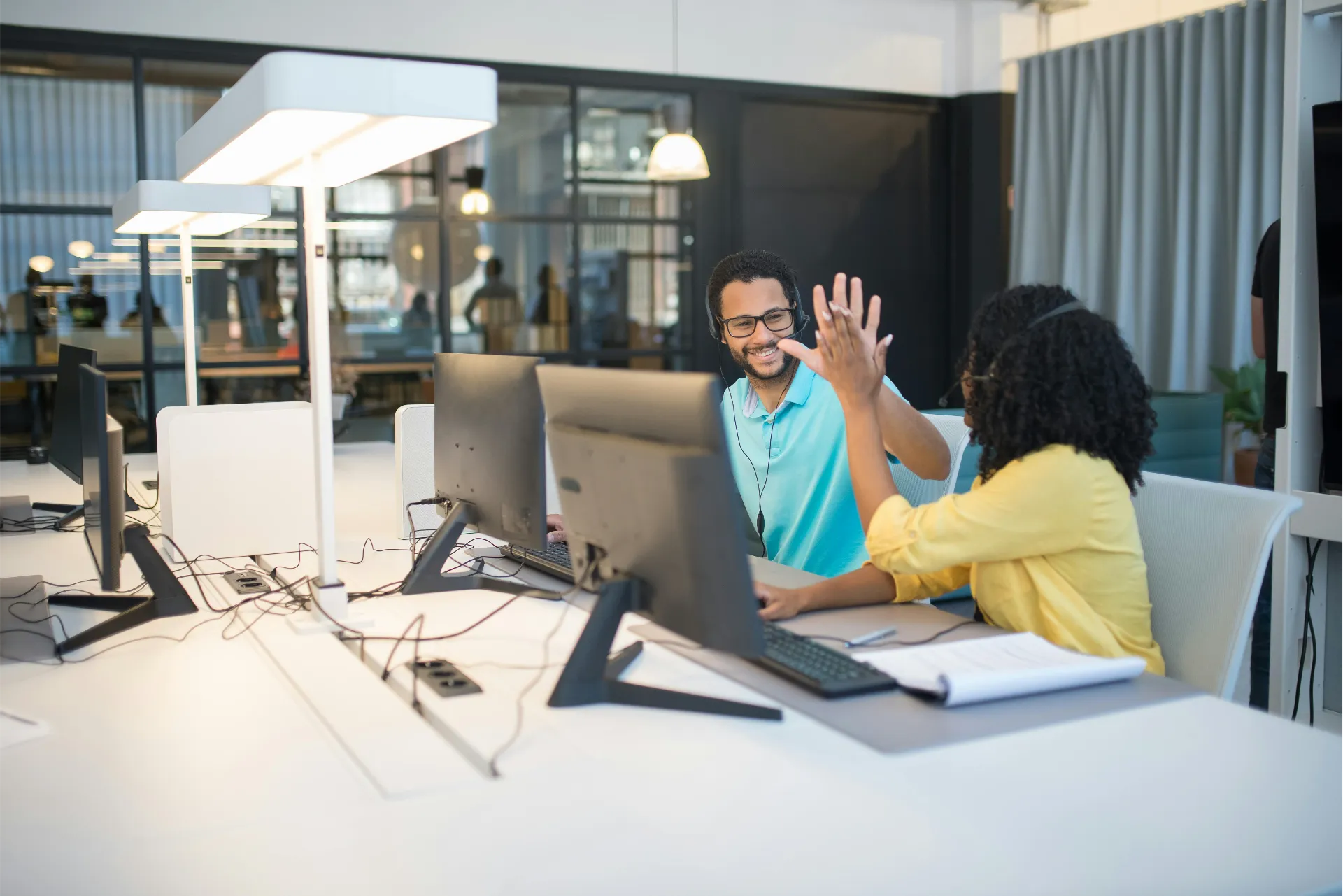 Office workers reviewing business results on a large display.